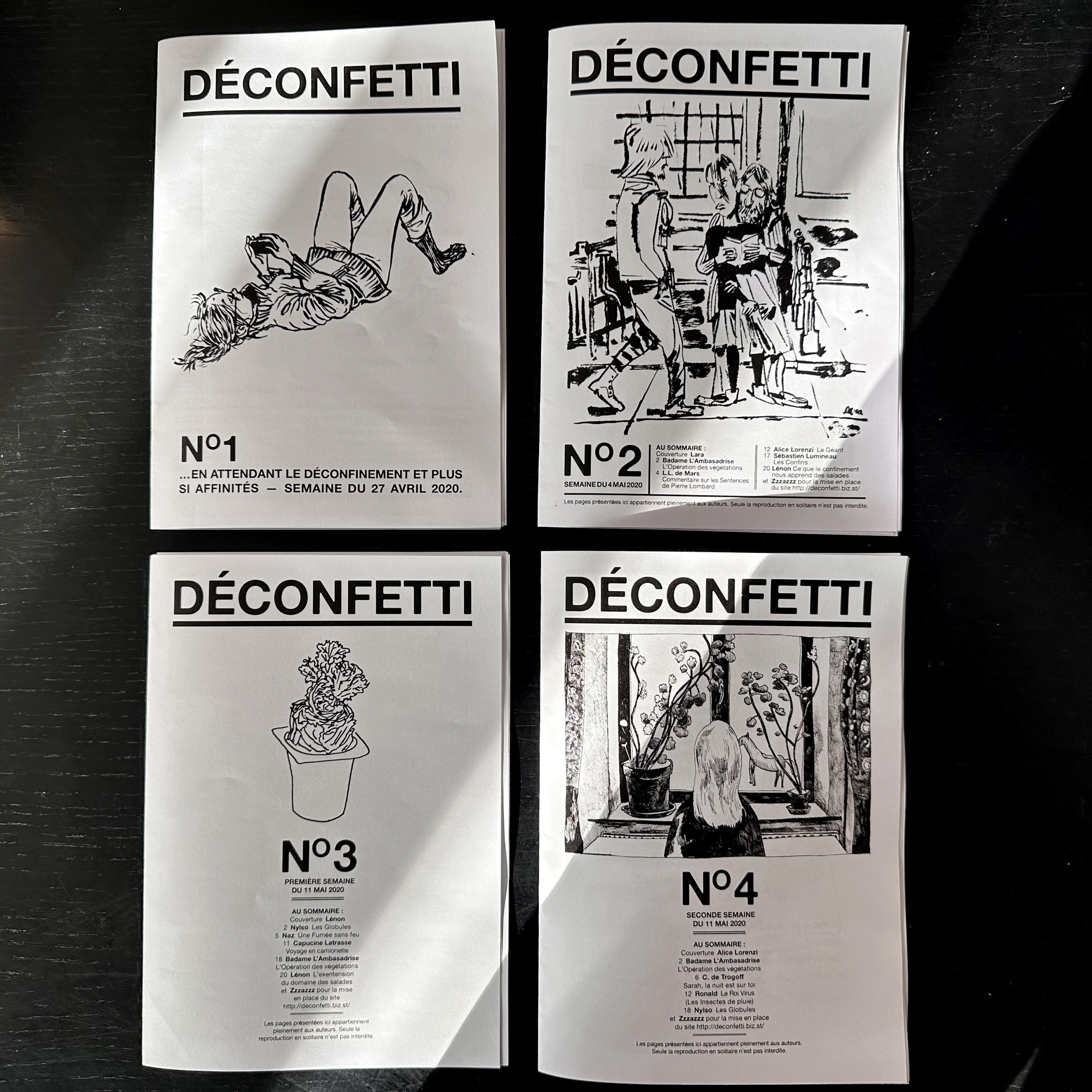 l’exposition collective Deconfetti rappellera l’aventure de ce fanzine né en avril 2020, en plein confinement durant l’épidémie de Covid, et qui se poursuivra pendant plus de 3 ans. 73 numéros, près de 1500 pages réalisées plus de 20 auteurs de la mouvance alternative.